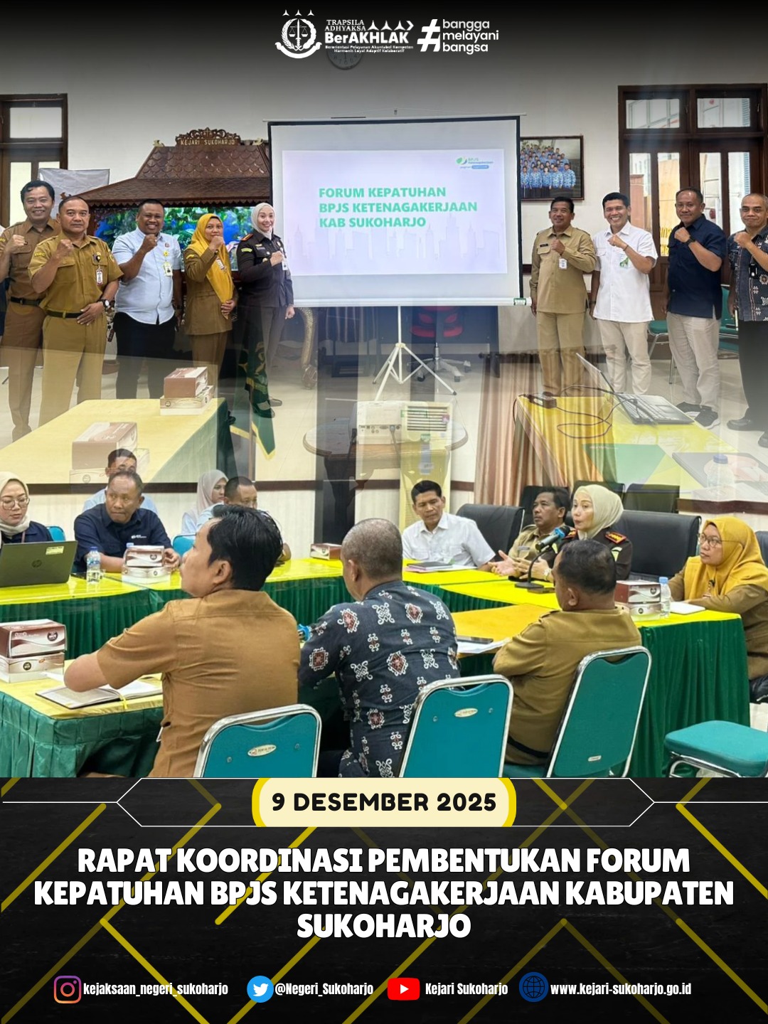 Bahwa pada hari Selasa 09 Desember 2025 Pukul 12.30 WIB, bertempat di Aula Kejaksaan Negeri Sukoharjo, telah dilaksanakan Rapat Koordinasi Pembentukan Forum Kepatuhan BPJS Ketenagakerjaan Kabupaten Sukoharjo.